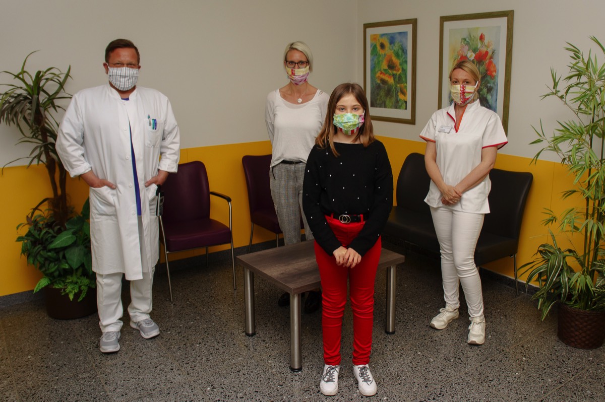 Die 10-jährige Sophia, Tochter unserer Mitarbeiterin Frau Hüttner, hat die schulfreie Zeit nicht nur fürs Lernern ;-) genutzt. Sie hat schnell mitbekommen, wie wichtig Schutzmaßnahmen in dieser Zeit sind und wie dringend diese gerade in den Kliniken und Praxen benötigt werden. Kurzerhand hat sie sich von ihrer Oma übrige Stoffe aus Vorhängen und alter Bettwäsche zusammengesucht und ganz alleine tolle Mund-Nasen-Schutzmasken genäht. Einen Teil davon hat sie dann dem gesamten Praxis-Team gespendet. Den Männer „gestreift“, den Damen „bunt“.